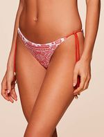 Tanga amarradinha estampada. Modelo com cobertura pequena, laterais finas ajustáveis com ponteiras de metal no banho Ouro Fosco e acabamento limpo.