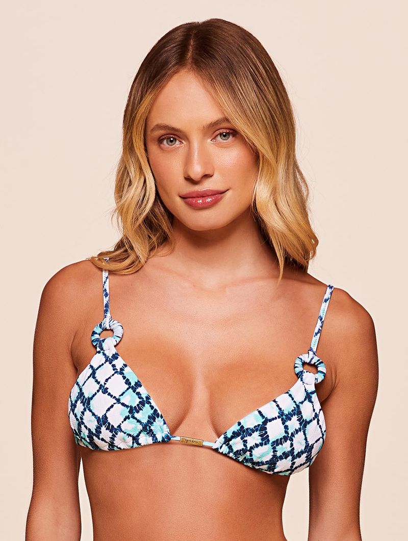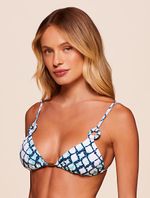 Top cortininha estampado. O modelo possui bojo removível, com alças fixas com regulagem, detalhe de argola encapada e amarração nas costas.