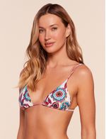 Top cortininha estampado. O modelo possui bojo removível, alças fixas com regulagem e amarração nas costas. Aviamentos de metal no banho de Ouro Velho.