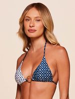 Top cortininha estampado. O modelo possui bojo removível, com alças finas para amarração no pescoço ou nas costas. Detalhe de argola em metal no banho Ouro Velho no centro do busto..