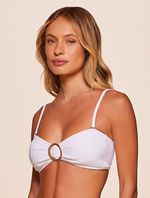 Top faixa liso. O modelo possui bojo fixo, com alças removíveis, passante no centro do busto e fecho de imã no banho de Ouro Fosco nas costas.