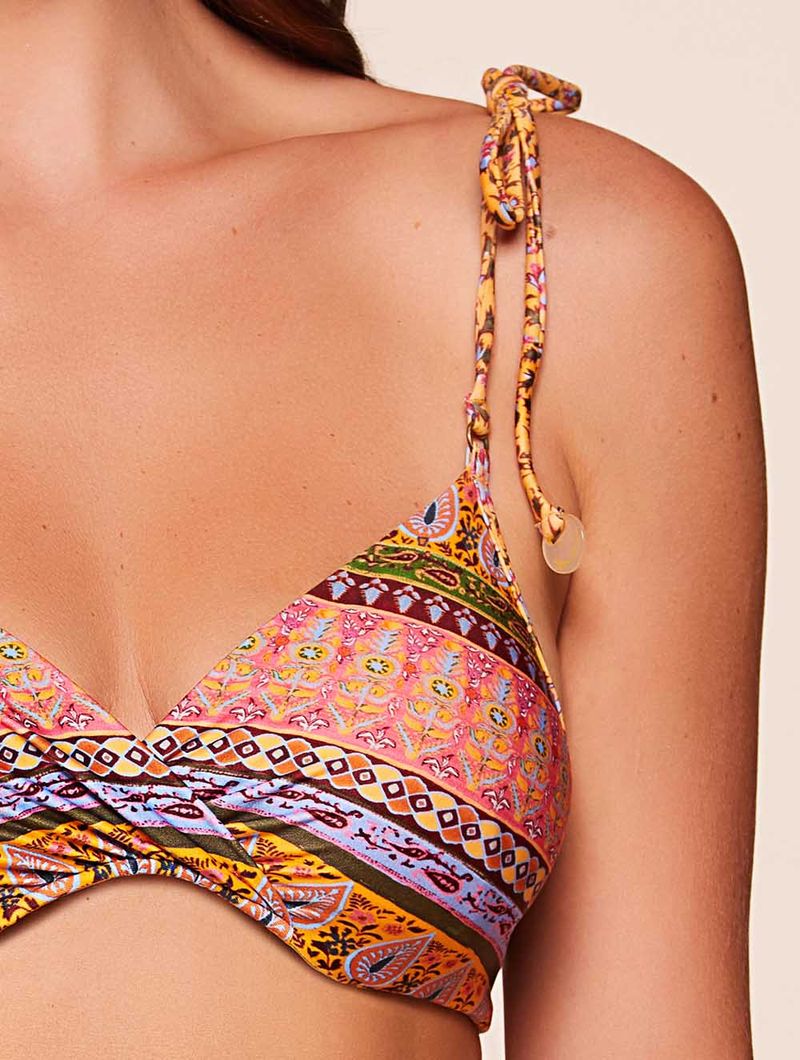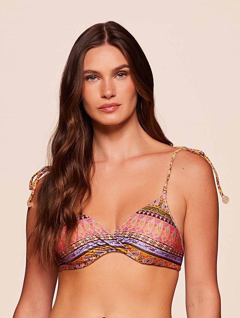 Top meia taça estampado. O modelo possui bojo removível, com decote transpassado, amarração nas costas, e nos ombros com ponteiras em madrepérola. Peça com aro para maior sustentação.